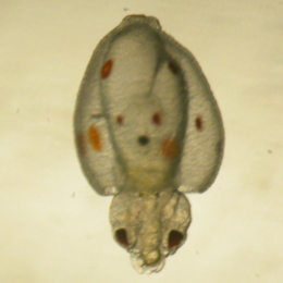 A larva recém-nascida da lula de Humboldt, gigas / Dosidicus /, um produto da fecundação artificial. Os cromatóforos em primeiro lugar, o saco de tinta, e os olhos podem ser facilmente visto. Também são visíveis o saco vitelino interna que irá sustentar o filhote durante seus primeiros dias de vida.
